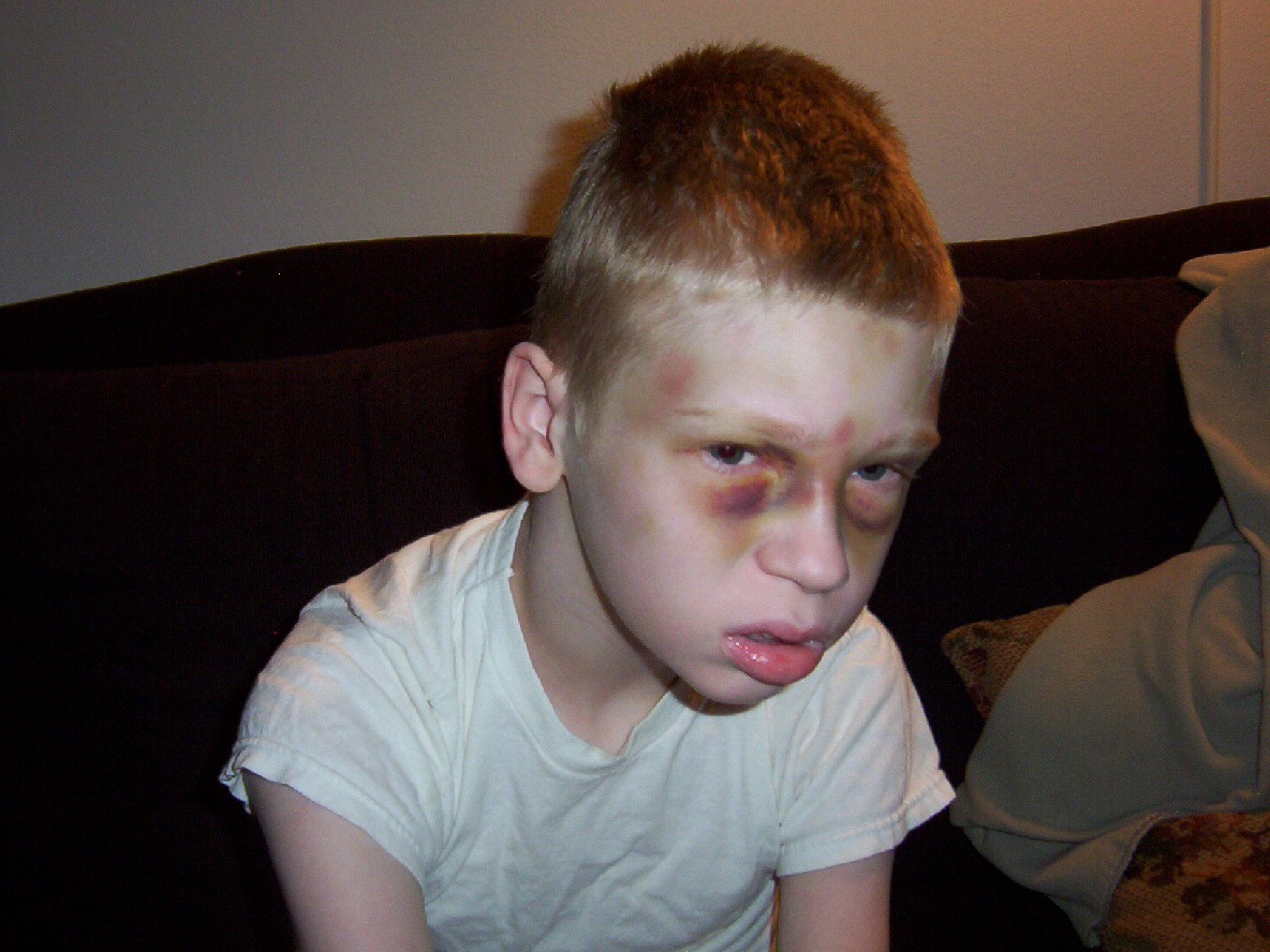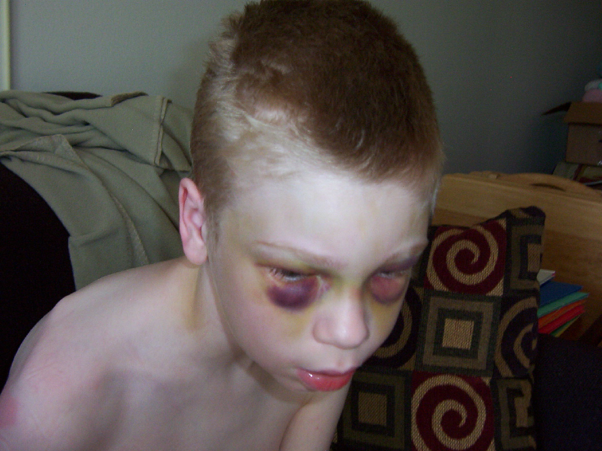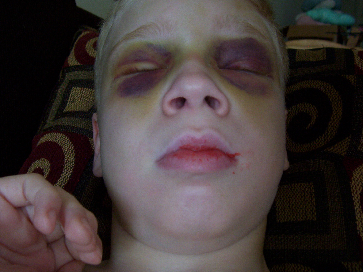 At court, the 'Child-Beater' stated that she rammed My head on the Top-Rail on My bed Once, then I went around smashing My head all the way around it, causing all of the bruising. The 'Child-Beater' got off easy. My Dad ensured that the 'Child-Beater' could not be left alone with anyone unable to defend themself, meaning that she could not work around children or the elderly. She used to work as an Registered Nurse through a company that handled the Elderly. She lost all rights to her children.